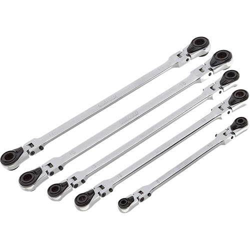 This 5-piece XXL double box-end reversible flex wrench set features an advanced Headlock flex mechanism, preventing the head from overextending and ensuring smooth, controlled movement during use. The flex-head design allows the wrench to pivot into multiple angles, giving you superior access in tight, obstructed, or deep-recessed areas—perfect for engine compartments, machinery components, and confined mechanical spaces.